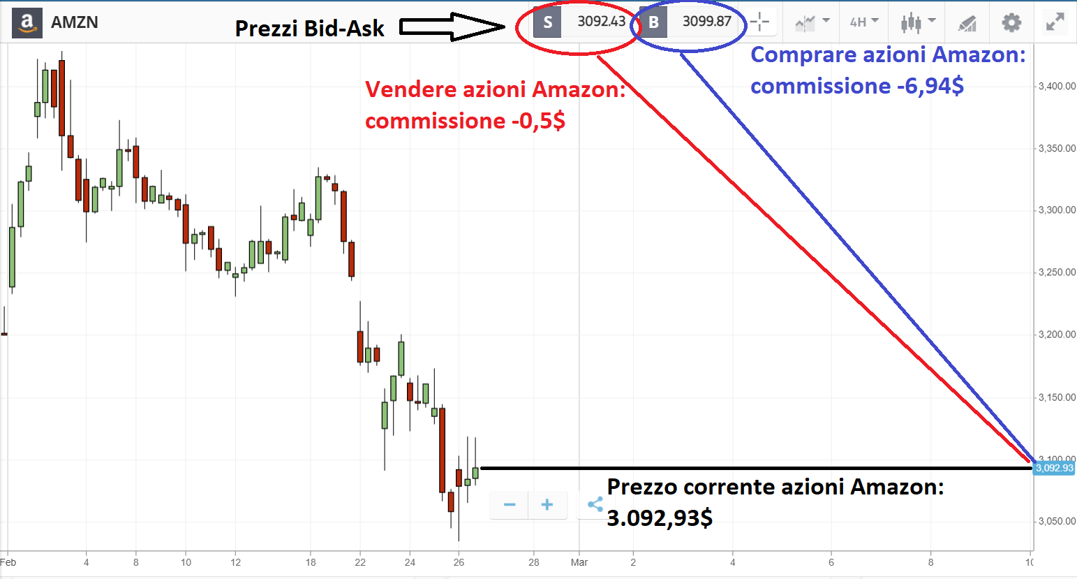 Per andare in profitto, dunque, le azioni Amazon dovranno superare una quotazione di almeno 3127,63$. Un rialzo possibile ma che ti priva di un iniziale profitto vitale per la riuscita del tuo investimento.